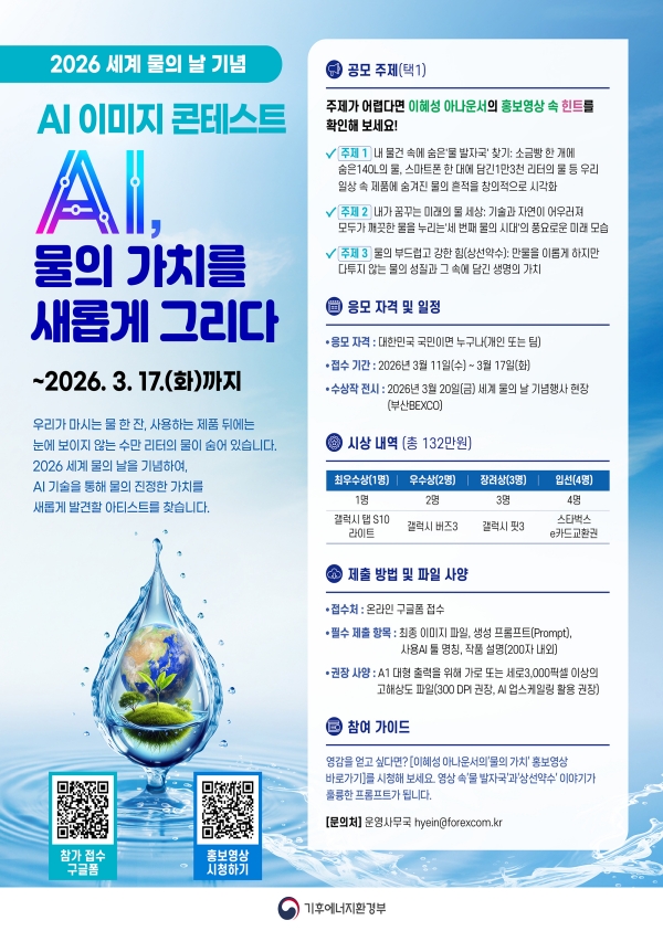 2026 세계 물의 날을 기념해 물의 숨은 가치와 물 발자국을 AI 이미지로 표현하는 콘테스트다. 대한민국 국민은 개인 또는 팀으로 참여할 수 있으며 수상작은 2026년 3월 20일 부산 BEXCO 현장에 전시된다.