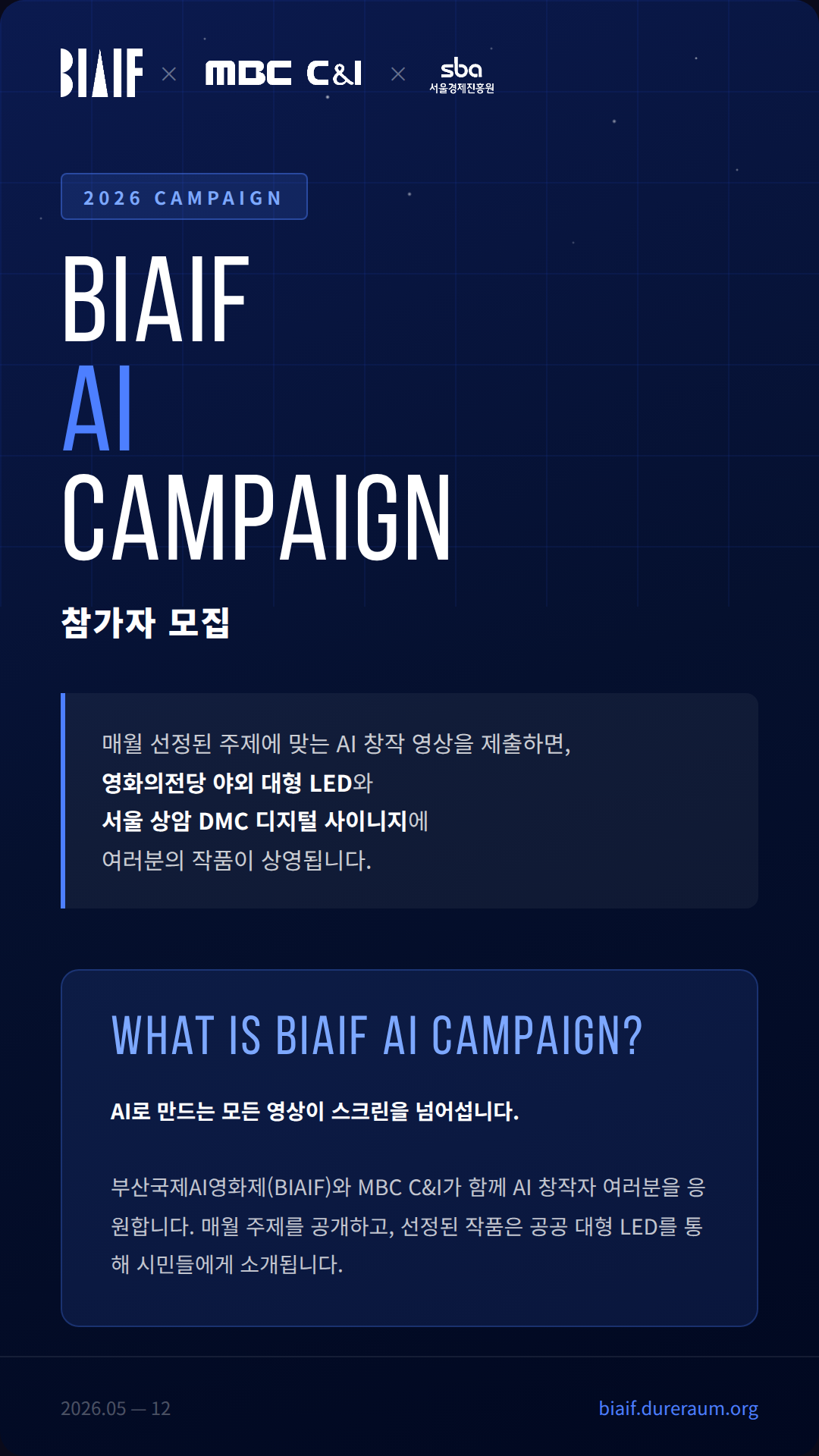 부산국제AI영화제(BIAIF)와 MBC C&I가 함께 AI 창작자들을 대상으로 운영하는 월간 영상 캠페인이다. 2026년 5월부터 12월까지 매월 새로운 주제를 공개하고, 선정 작품은 공공 대형 LED를 통해 시민에게 소개된다. 캠페인 기간은 2026년 5월부터 12월까지이며 매월 진행된다. 각 월차 마감은 매월 25일 18:00이고, AI 영화·영상 창작자 누구나 지원할 수 있다. 매월 약 5편 내외를 선정하며, AI Film Makers 투표와 운영진 종합 평가를 반영한다. 선정작은 선정 후 약 1개월 뒤 상영된다. 상영 매체는 영화의전당 야외 상영관 대형 LED와 서울 상암 DMC 디지털 사이니지다. 접수는 이메일 mbccni3@gmail.com으로 진행하며, 제출 시 작품 소개, 창작자명, 연락처(이메일), 썸네일 또는 캡처 이미지를 함께 보내야 한다. 영상 제출 규격은 mp4 형식, 500MB 이하, 비트레이트 10Mbps 이하, 길이 30초 이하다. DMC 상영용 규격은 1536x1792(정면 1024px), 영화의전당 상영용 규격은 1248x2112다. 제작 가이드로는 영상 내 광고성 기업명·로고·방영시간 삽입이 불가하며, 제목·캐릭터명·아티스트명은 포함 가능하되 좌상·우상 블박이식 삽입은 지양해야 한다. 해상도 규격에 맞춰 제작해야 하며, 가로형 영상은 상하단 심미성을 고려해 이미지 활용 또는 화면 비율에 맞게 편집해야 한다. 또한 자막 "이 영상은 생성형 AI 기술로 제작된 영상입니다"를 삽입해야 한다. 월별 주제는 5월 가족, 6월 영웅, 7월 환경, 8월 역사, 9월 추석, 10월 영화, 11월 미래, 12월 크리스마스다.