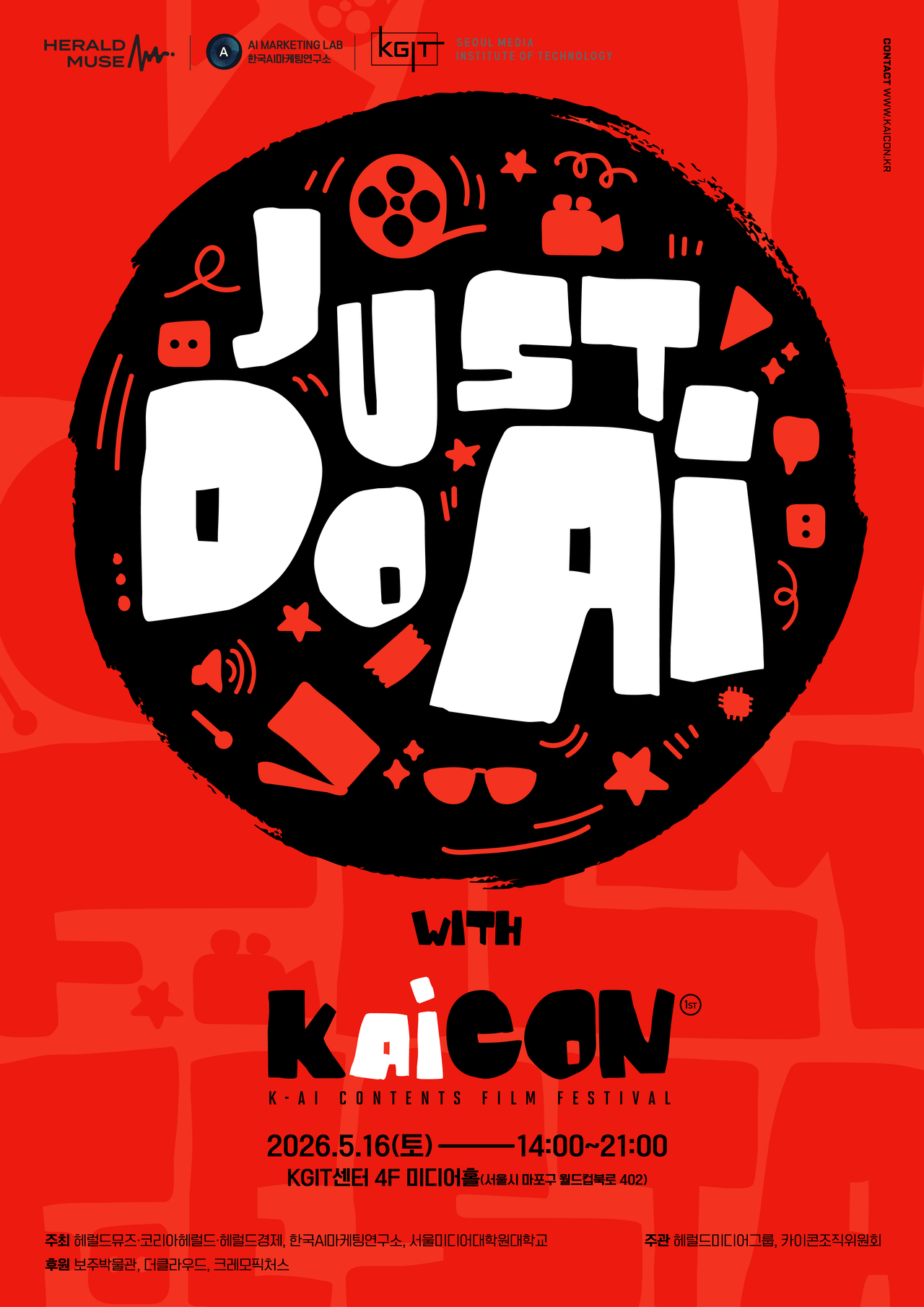 KAICON (카이콘) AI Film Festival이 주최하는 글로벌 AI 콘텐츠 영화제 공모전이다. FilmFreeway 페이지 기준 영화제는 Film Festival, Screenwriting Contest, Music Contest 성격을 함께 가지며 AI 영화, AI 감독, AI 뮤직비디오, AI 광고, AI 애니메이션, AI 다큐멘터리, AI 포스터, 청소년 부문, 아리랑 K-컬처 부문으로 작품을 받는다. 참가 자격은 전 세계 창작자이며, 일반 부문은 20세 이상 개인 또는 팀, 청소년 부문은 14세부터 19세의 중·고등학생 개인 또는 팀이 지원할 수 있다. 청소년 부문 지원자는 필요 시 연령 증빙을 제출해야 하며, 모든 출품자는 제출 작품에 대한 법적 권리를 보유해야 한다. 모든 출품작은 생성형 AI를 의미 있고 창의적으로 활용해야 하고, 사용한 AI 도구에 대한 크레딧을 명시해야 한다. 제출은 FilmFreeway 온라인 접수로 진행되며, 제작 기간은 2025년 4월 28일부터 2026년 4월 27일까지다. 작품 길이는 20분 이내이고 4K 또는 Full HD, MP4·MOV 형식을 권장하며 원어와 관계없이 영어 자막이 필수다. 기본 화면비는 16:9이며 예술적 의도에 따른 예외를 허용한다. 접수 마감은 2026년 4월 27일 23:59 KST이며, 결과 발표는 2026년 5월 5일, 최종 심사 및 시상식은 2026년 5월 16일 서울 KGIT센터 미디어홀에서 열린다. 총상금은 1,100만 원으로 대상 300만 원을 포함해 AI 영화, 광고, 뮤직비디오, 감독, 다큐멘터리, 시나리오, 포스터, 애니메이션, 심사위원 특별상, 청소년상, 아리랑 K-컬처 특별상 등이 수여된다.