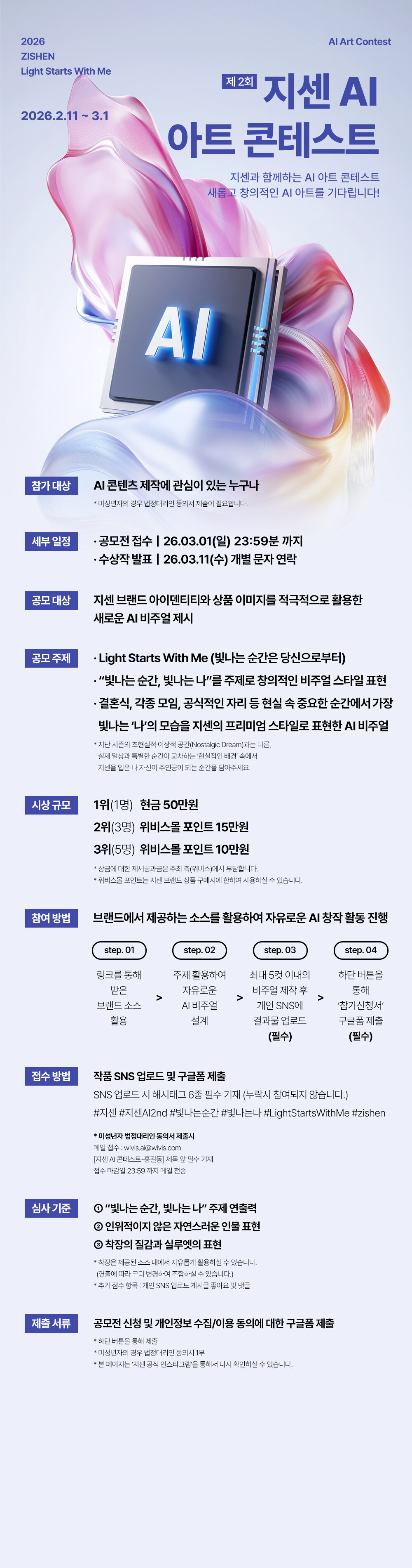 위비스몰 기획전(planSq=8292)과 공식 구글폼에 따르면 콘테스트 명칭은 '제 2회 지센 AI 아트 콘테스트'이며 접수는 구글폼 링크로 진행된다. 포스터/페이지 표기 기간은 2026-02-11부터 2026-03-01까지이며, 접수 마감은 2026-03-01 23:59, 발표 일정은 2026-03-11로 안내되어 있다. 제출 시 SNS 공개 게시글 링크와 지정 해시태그(#지센 #지센AI2nd #빛나는순간 #빛나는나 #LightStartsWithMe #zishen)를 포함해야 하며, 원본 파일은 wivis.ai@wivis.com으로 제출한다. 원본 제출 규격은 총 100MB 이하, 최대 5컷, JPG/PNG 이미지다.